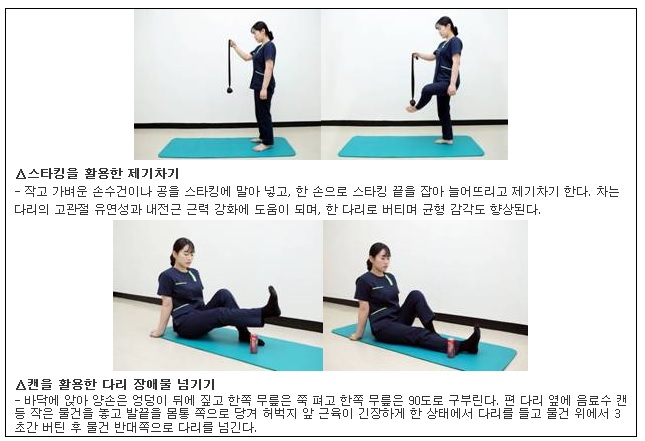 근력은 근육의 양이 좌우하고, 근력을 키우려면 근력운동을 반드시 해야 합니다. 일주일에 3~4회 규칙적인 운동을 통해 관절에 무리가 가지 않는 범위 내에서 하는 것이 효과적입니다. 근감소증 예방을 위해서는 노년기 이전부터 근력운동과 유산소운동을 통해 근력을 키워두는 것이 좋습니다. 특히 몸의 중심을 바로잡는 기립근과 엉덩이, 허벅지 근육을 키우는 것이 중요합니다. 또한 허벅지 앞뒤에 대퇴사두근과 대퇴이두근이라는 큰 근육이 있기 때문에 허벅지 위주로 하는 것이 좋습니다. 신체 유연성과 균형성을 높이는 스쿼트는 허벅지가 무릎과 수평이 될 때까지 앉았다 섰다 하는 동작으로, 가장 기본적인 하체 운동입니다. 이런 스쿼트 운동은 허리와 엉덩이. 무릎 그리고 발목 부상을 예방하는데 도움이 됩니다.